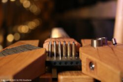 The outside of the oak wood has protected the inside of the beam from wind and weather for centuries. Now the roles have been reversed. The inside of the wood forms the body and the outside finds its dignified and protected place on the truss rod cover, the potentiometers, and the recessed lid of the whiskey compartment. It’s the same with many people. First, parents take care of their children, and later, children take care of their parents.