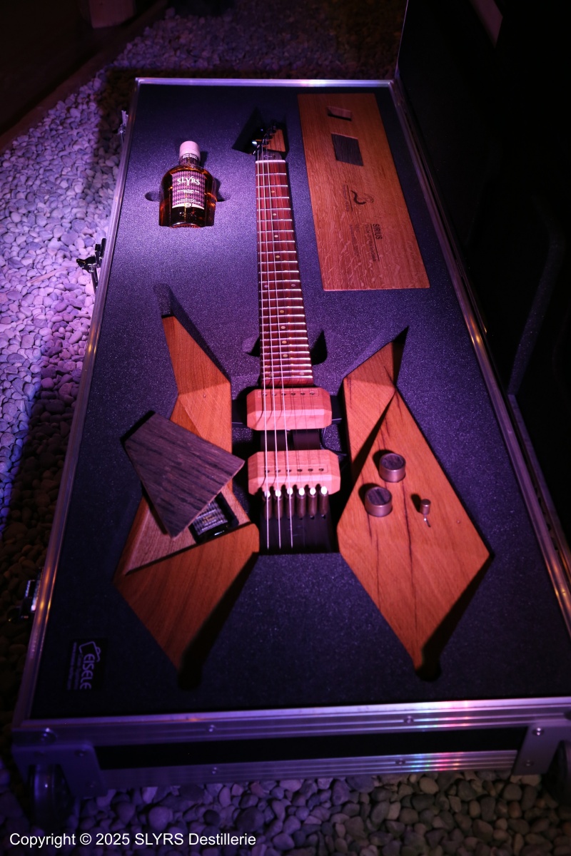 Body: Oak felled in 17xx with oil finish / black anodized aluminum / 2013 Slyrs Whisky (12 years aged) bottle in the upper body wing