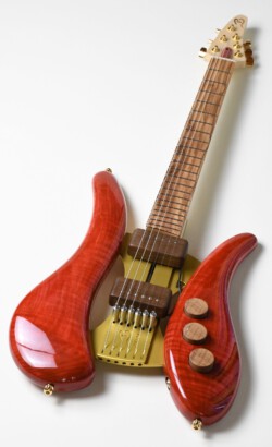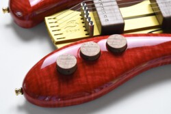 Die ORION Magma Queen ist eine ganz besondere Edition mit magmarot gebeiztem Riegelahorn-Korpus. Vulkane fördern oft Edelmetalle aus dem Inneren der Erde an die Oberfläche. Um dies zum Ausdruck zu bringen, sind die Metallteile in Goldoptik.