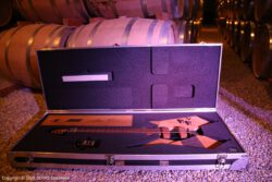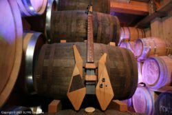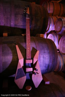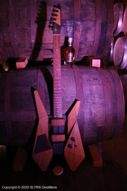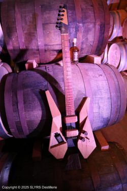 Korpus: Eiche gefällt 17xx, geölt / schwarz eloxiertes Aluminium / 2013 Slyrs Whisky (12 years aged) Fläschchen im oberen Korpusflügel