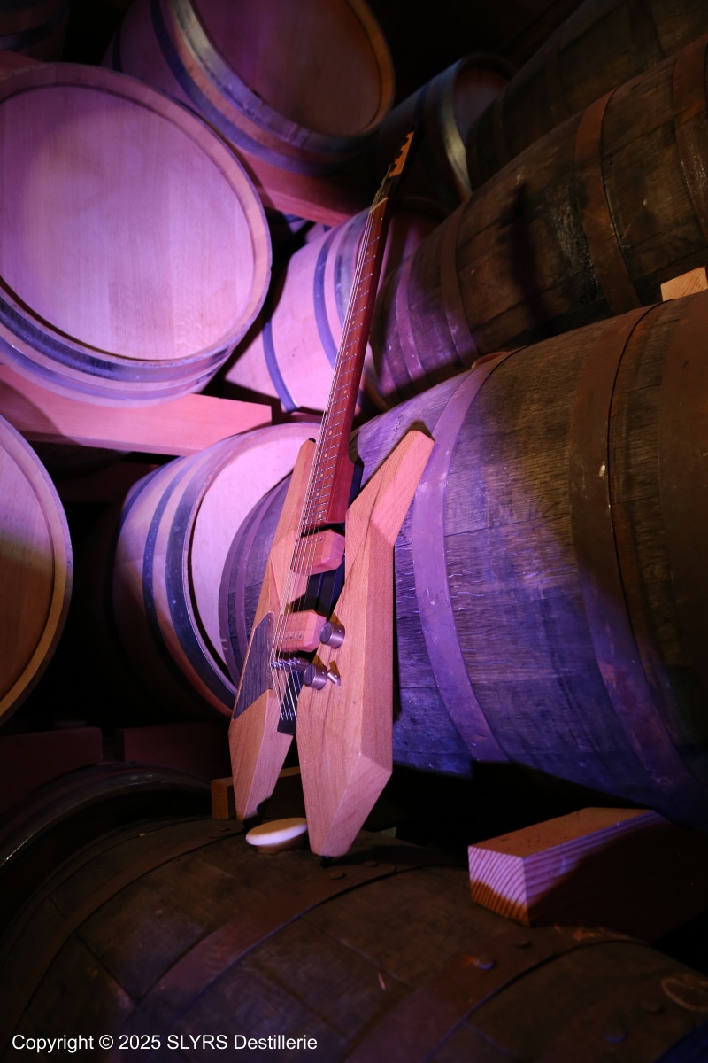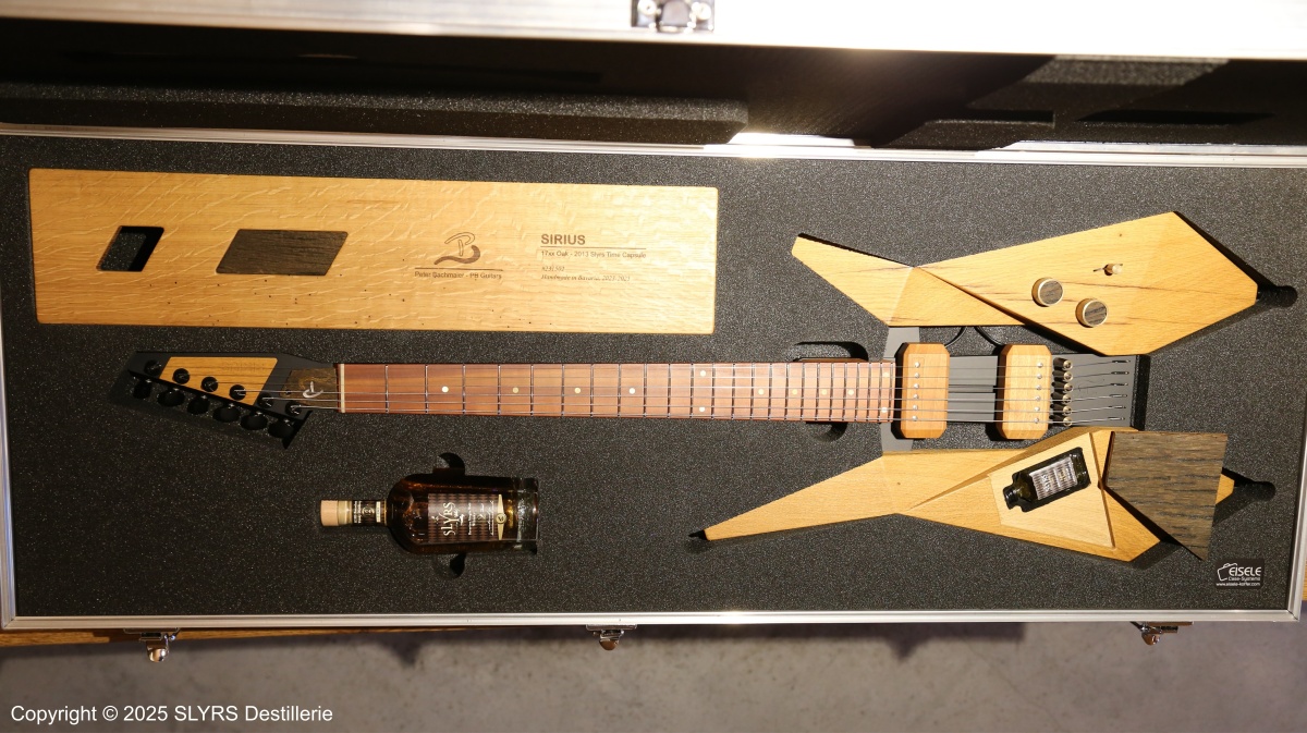 Korpus: Eiche gefällt 17xx, geölt / schwarz eloxiertes Aluminium / 2013 Slyrs Whisky (12 years aged) Fläschchen im oberen Korpusflügel